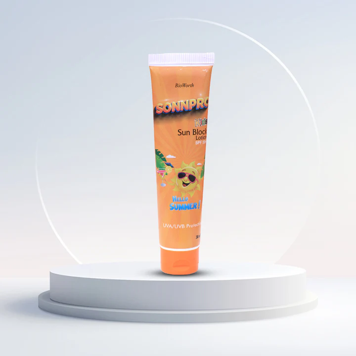 SONNPRO Kids Sun Block Lotion is a specially formulated sun protection lotion designed for the delicate skin of children. With a high SPF 50+ rating, it provides robust defense against harmful UVA and UVB rays, allowing kids to enjoy outdoor activities safely. The packaging features a playful “Hello SUMMER!” design, emphasizing its suitability for sunny days.